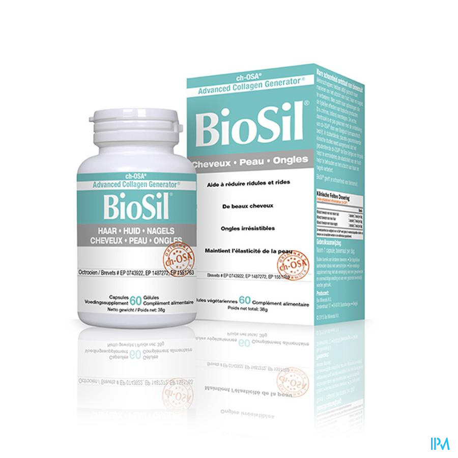 Biosil®, Advanced Collagen Generator® est un nutraceutique doté d'une formule unique et brevetée ch-OSA® (acide orthosilic stabilisé par la choline) qui garantit que votre corps produira plus de collagène, d'élastine et de kératine de l'intérieur, ce qui rendra la peau plus rebondie et plus élastique, réduira les rides et rendra les cheveux et les ongles plus forts et plus beaux. En outre, Biosil protège également contre la dégradation du collagène. Un effet 2 en 1 !