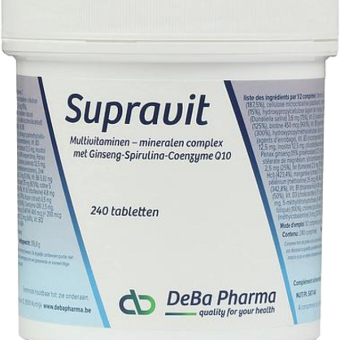 Supravit is een multivitaminen-mineralen preparaat die uw algemene tekorten aan vitaminen en mineralen aanvult. Een dagelijkse aanvulling met Supravit is dan ook primordiaal voor een goede energiehuishouding. Dit hooggedoseerd multivitaminen-mineralen com