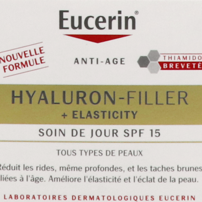 Hyaluron-Filler + Elasticity Dagcrème Rose SPF 30 van Eucerin is een anti-age dagcrème die onmiddellijk een rozige gloed geeft om een doffe huid op te frissen, diepe rimpels op te vullen, de elasticiteit van de huid te verbeteren, donkere vlekken als ge