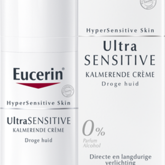 Eucerin UltraSENSITIVE Kalmerende Crème Droge huid wordt aanbevolen voor de overgevoelige huid waar het belangrijkste symptoom een onaangename huid is met een brandend, stekend gevoel of jeuk, maar zonder zichtbare tekenen van roodheid. Aangebracht na re
